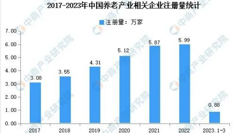 从养老产业相关企业注册量来看,在巨大的养老需求下,企业注册量呈逐年增长趋势,由2017年的3.08万家增长至2022年的5.99万家,复合年均增长率达18.1%。最新数据显示,截至2023年3月7日,2023年新增0.88万家企业。