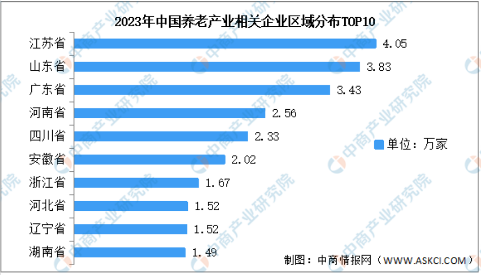 从区域分布来看,目前江苏省以4.05万家养老产业相关企业数量高居全国第一,山东、广东排名第二和第三,养老产业相关企业数量分别为3.83万家、3.43万家。此外,河南、四川、安徽、浙江、河北、辽宁、湖南跻身前十,依次排名第4-10名。整体来看,养老产业相关企业主要集中在江苏。