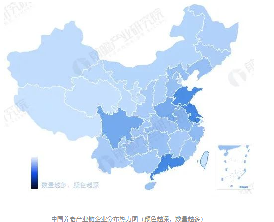 在企查猫平台对养老产业进行检索,数据显示,我国养老产业生产企业数量较多,江苏、广东、山东等区域养老相关企业较多。另外,相关代表性企业大多集中在北京、上海、广东、江苏等地。