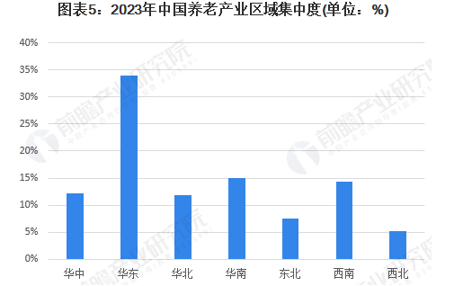 从区域集中度来看,我国养老产业区域集中度最高的是华东地区,占比约34%;其次是华南地区,达15%,西南地区达14.3%,华中地区达12.2%,华北地区达11%,东北地区和西北地区分别7.6%和5.1%。行业整体集中度偏高。