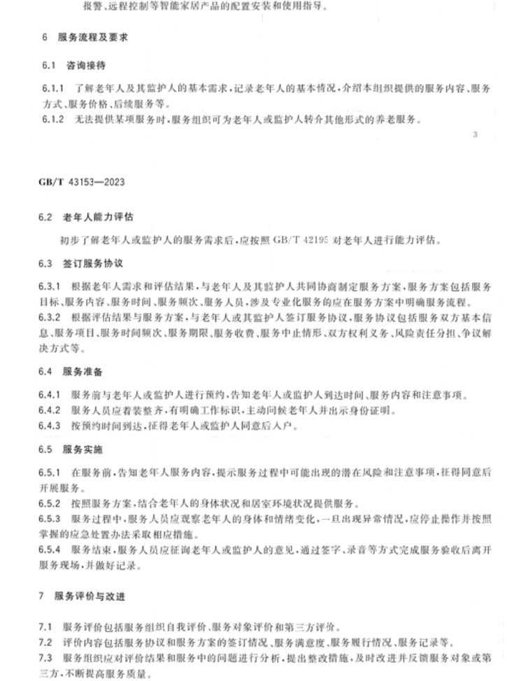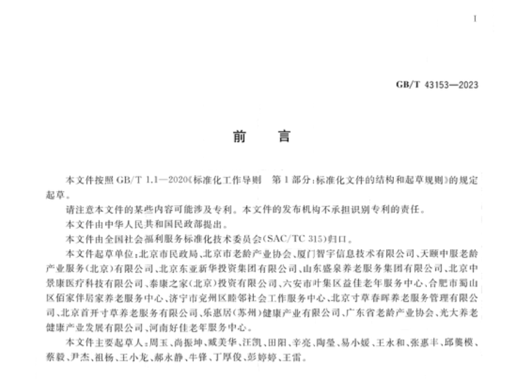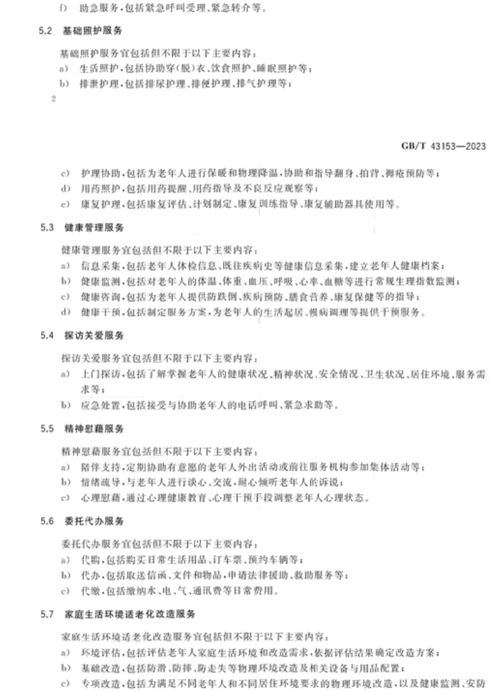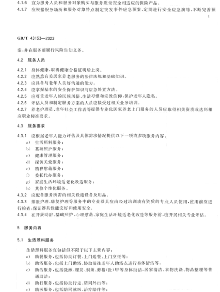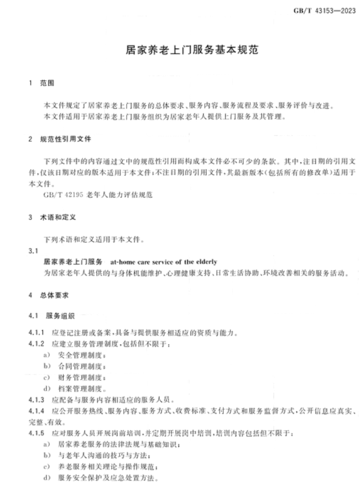近日,《居家养老上门服务基本规范》国家标准(gb/t 43153-2023)正式发布,这是我国针对居家养老上门服务发布的首个国家标准,将为合理界定居家养老上门服务范围、规范供给主体资质条件及供给流程内容要求等提供基本依据,对于推动居家养老服务标准化、规范化、专业化发展具有现实意义。