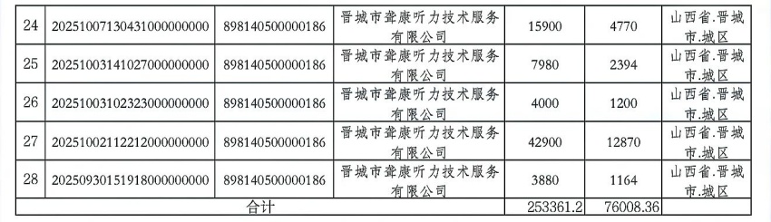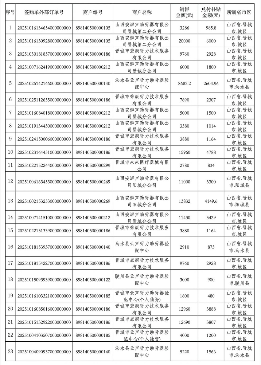 根据山西省民政厅等4部门《关于印发〈2025年山西省实施居家适老化改造产品消费补贴“晋孝焕新”行动方案〉的通知》文件要求,经第三方机构对10月份我市居家适老化改造产品消费补贴资金申请的初审和复审,晋城市民政局审批等程序,拟通过中国工商银行晋城泽州支行拨付2025年第一批居家适老化改造产品消费补贴资金,共涉及参与商户8家,通过资金审核28单,合计7.600836万元,现将有关名单进行公示。公示时间为2025年11月26日至2025年11月30日,公示期为5天。有异议者请在此期间的正常工作时间内以来电、来访的形式向晋城市民政局反映,逾期不再受理。受理电话:0356—2566257