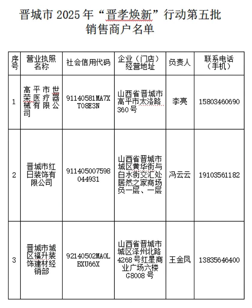 【通知公告】晋城市2025年居家适老化产品消费补贴“晋孝焕新”行动第五批销售商户名单公示